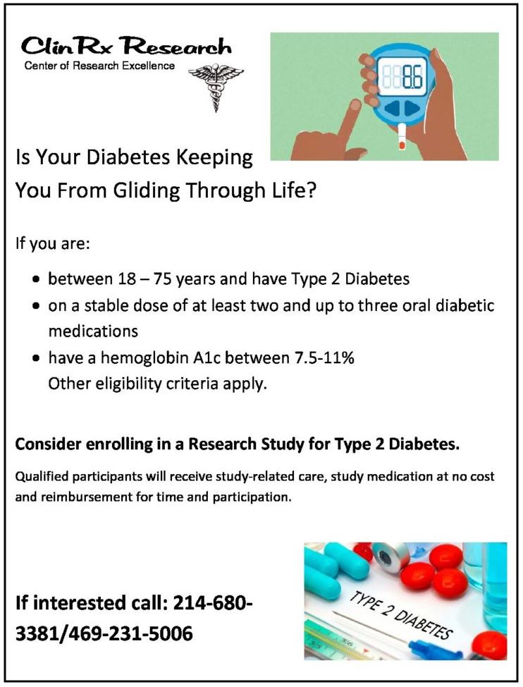 Diabetes Clinical Trial Diabetes Clinical trial: We are currently conducting several clinical trials. See below for information on Diabetes clinical trial. To find out more, click here or call (214) 680-3381 during business hours. Download