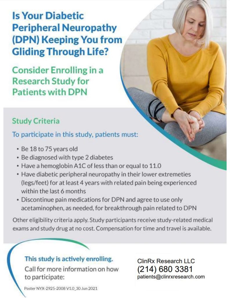 DPN Clinical Trial DPN Clinical trial: We are currently conducting several clinical trials. See below for information on DPN clinical trial. To find out more, click here or call (214) 680-3381 during business hours. Download