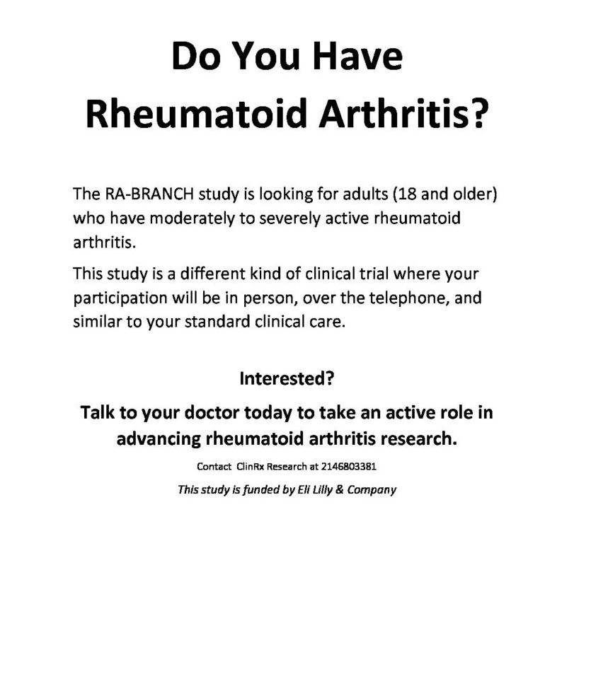 Rheumatoid Arthritis Clinical Trial Rheumatoid Arthritis Clinical trial: We are currently conducting several clinical trials. See below for information on Rheumatoid Arthritis clinical trial. To find out more, click here or call (214) 680-3381 during business hours. Download